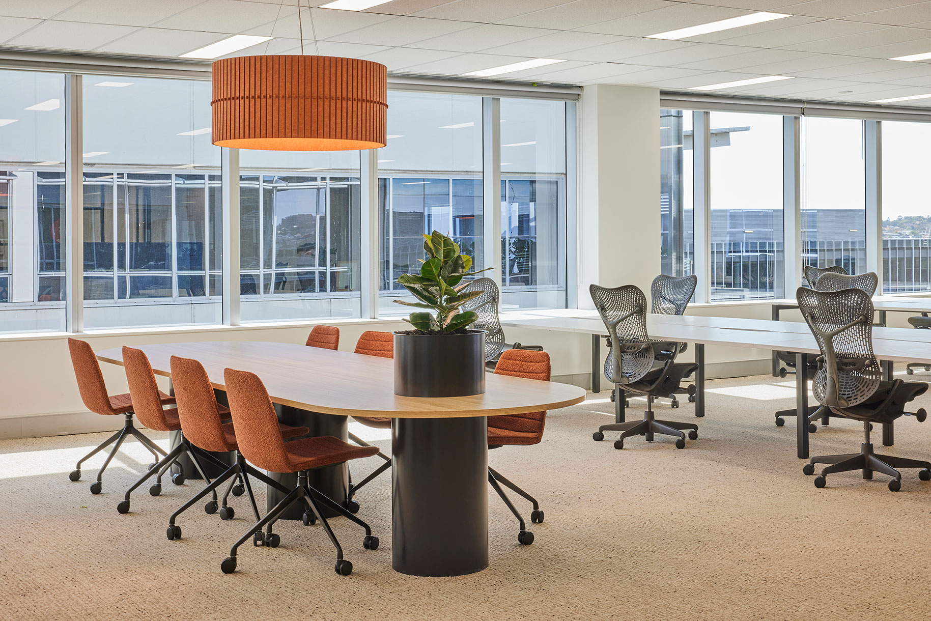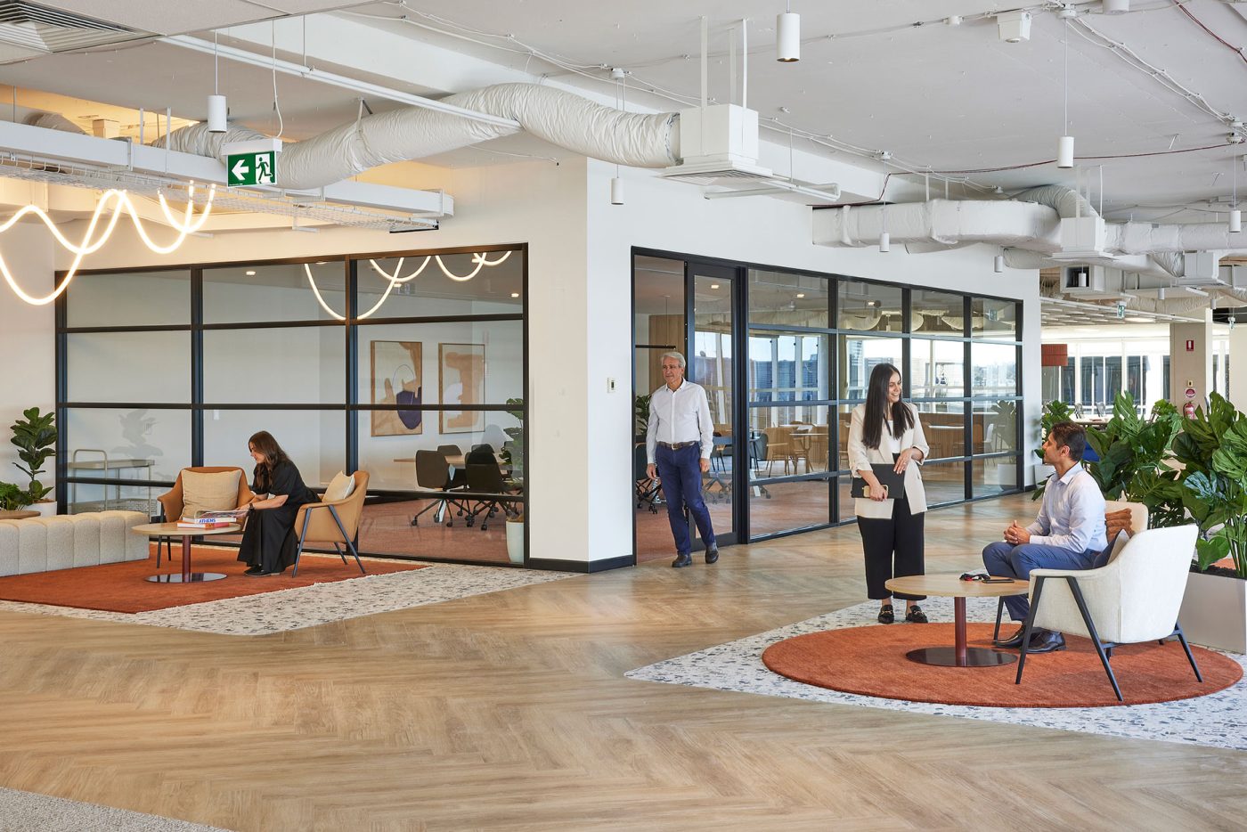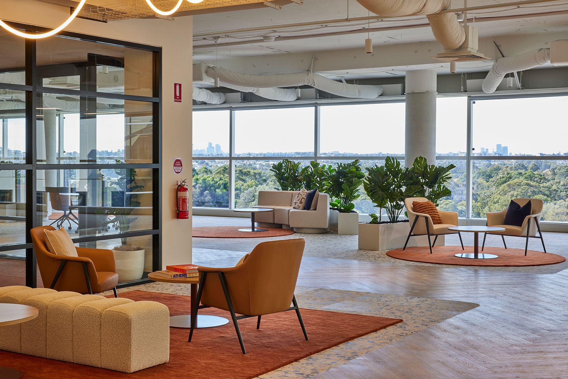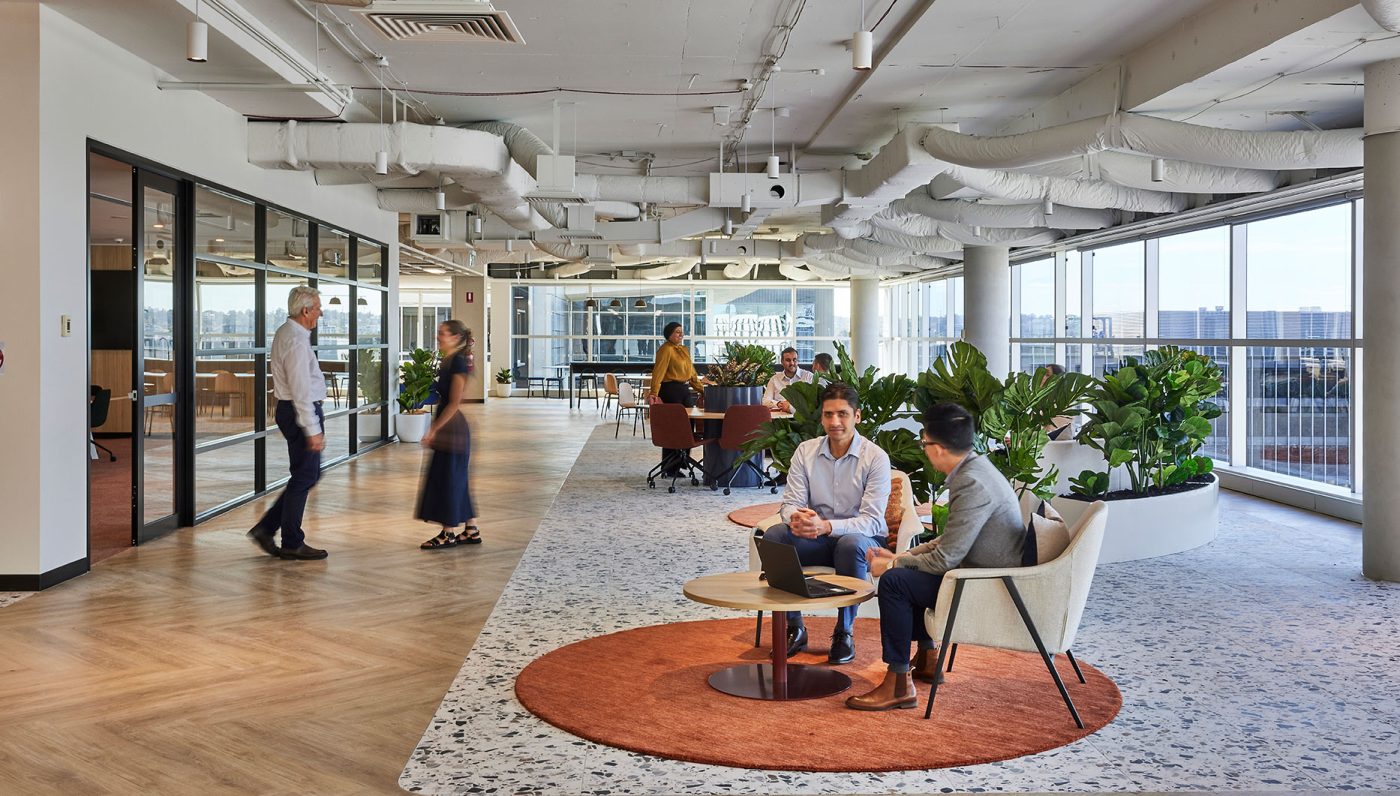Inspired by Sydney’s coastal heritage, the Display Suite blends warm terracottas, sandy beiges, and oceanic blues to create a sophisticated, nature-inspired workspace. Organic textures, intimate nooks, and a calming palette encourage both collaboration and quiet focus.