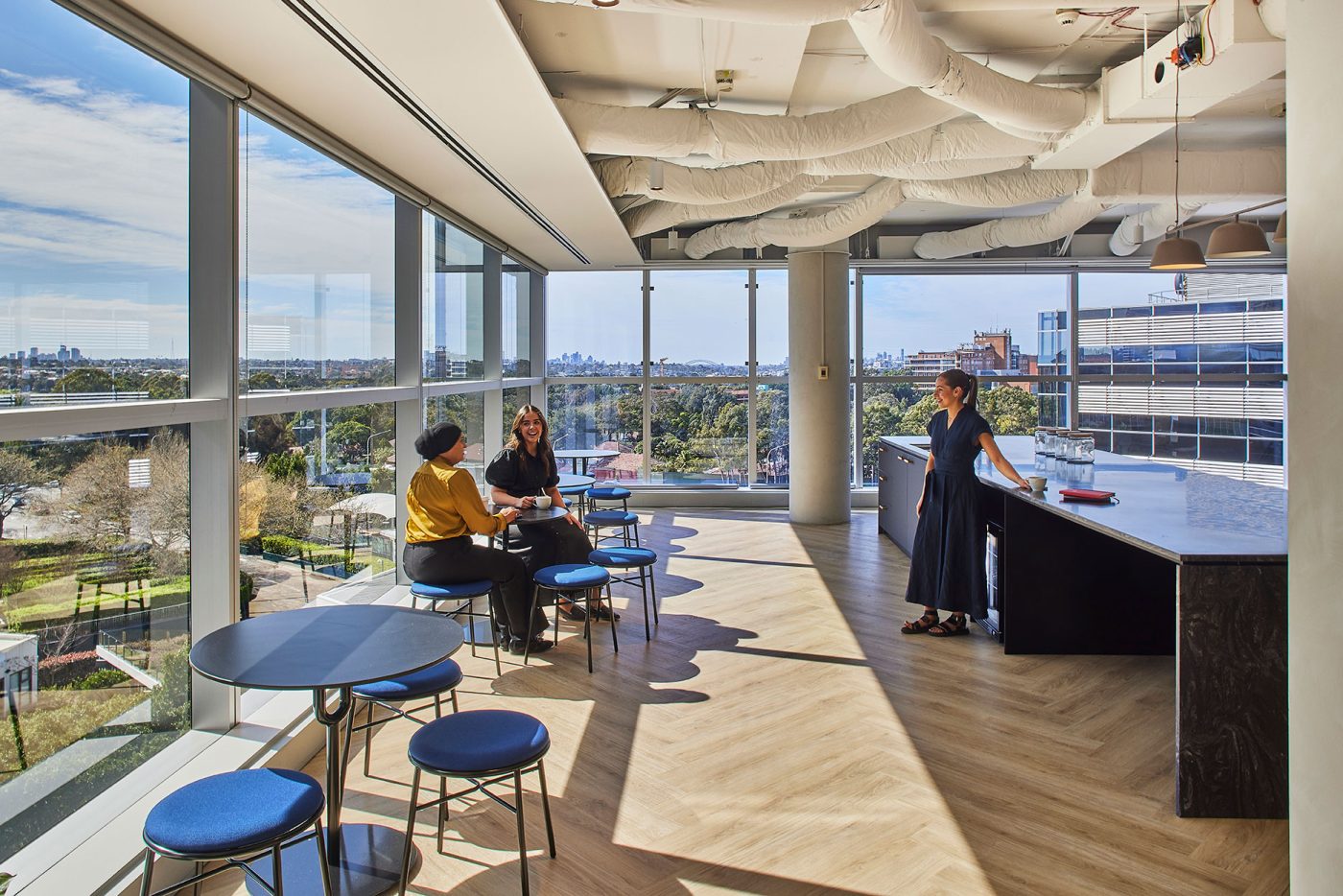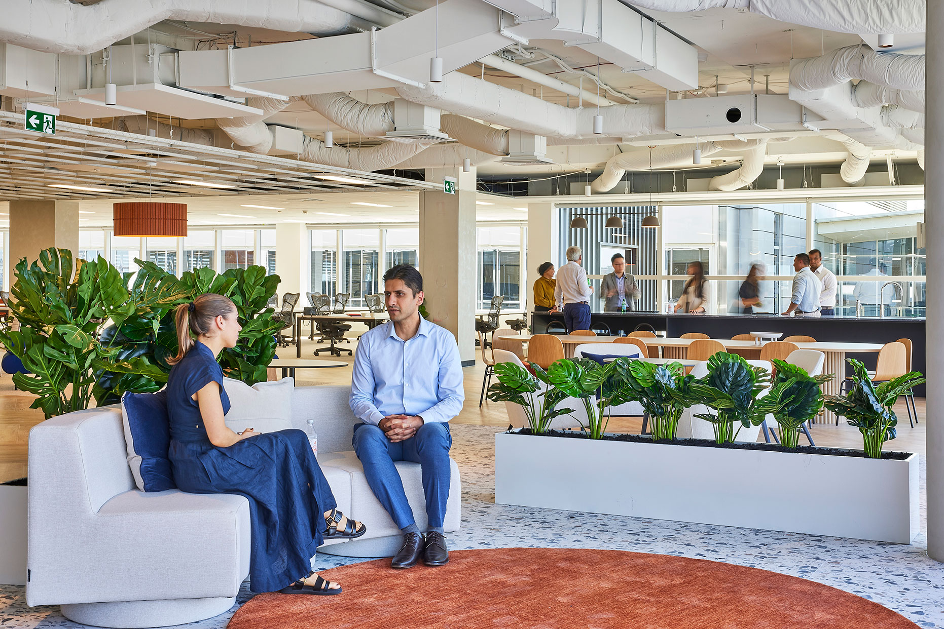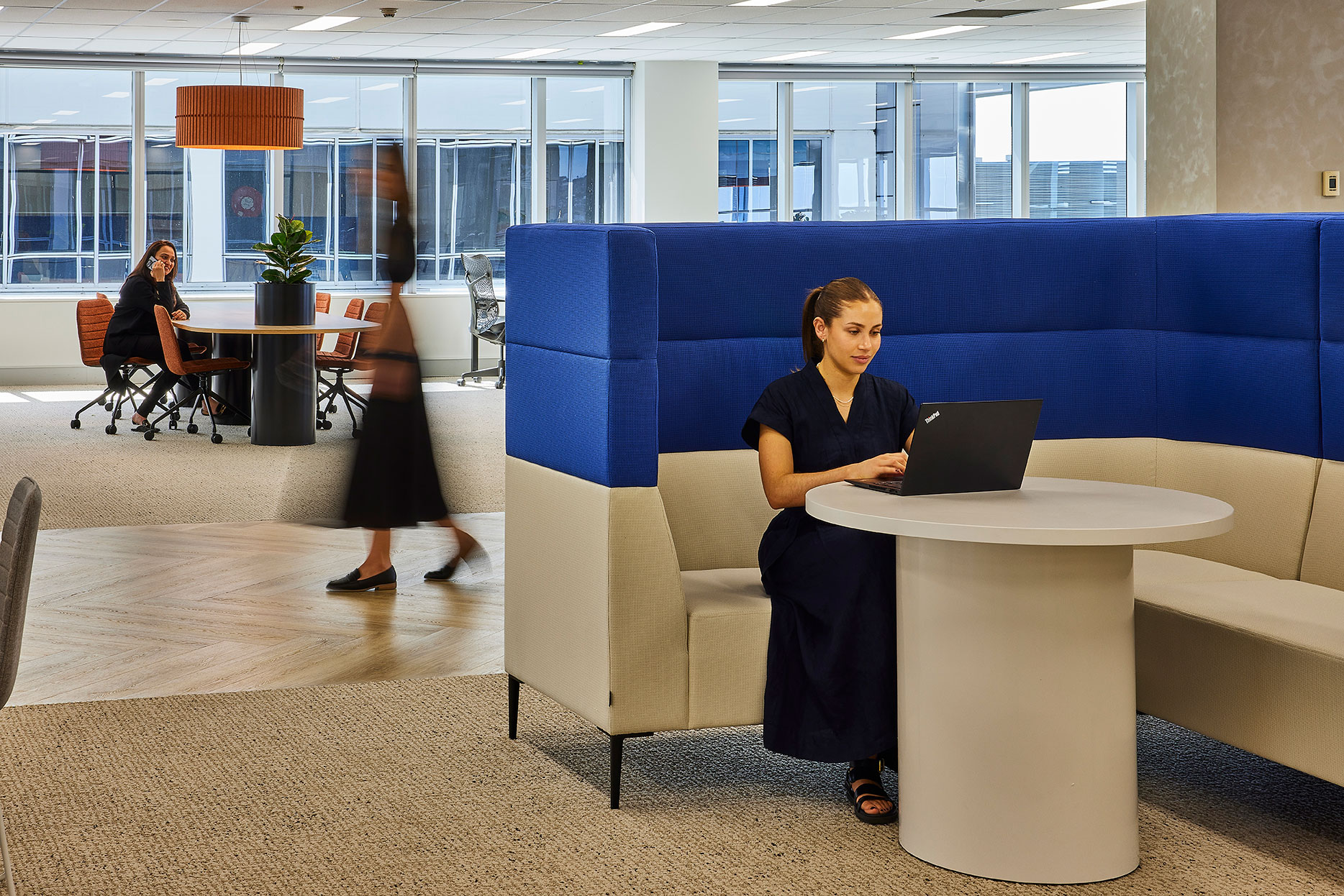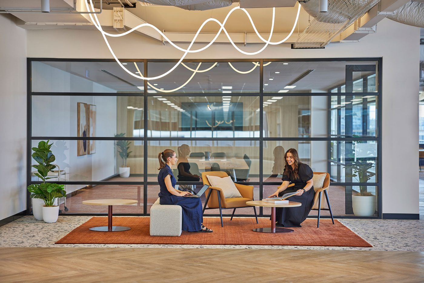 Inspired by Sydney’s coastal heritage, the Display Suite blends warm terracottas, sandy beiges, and oceanic blues to create a sophisticated, nature-inspired workspace. Organic textures, intimate nooks, and a calming palette encourage both collaboration and quiet focus.